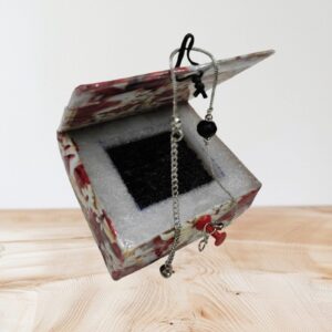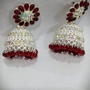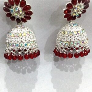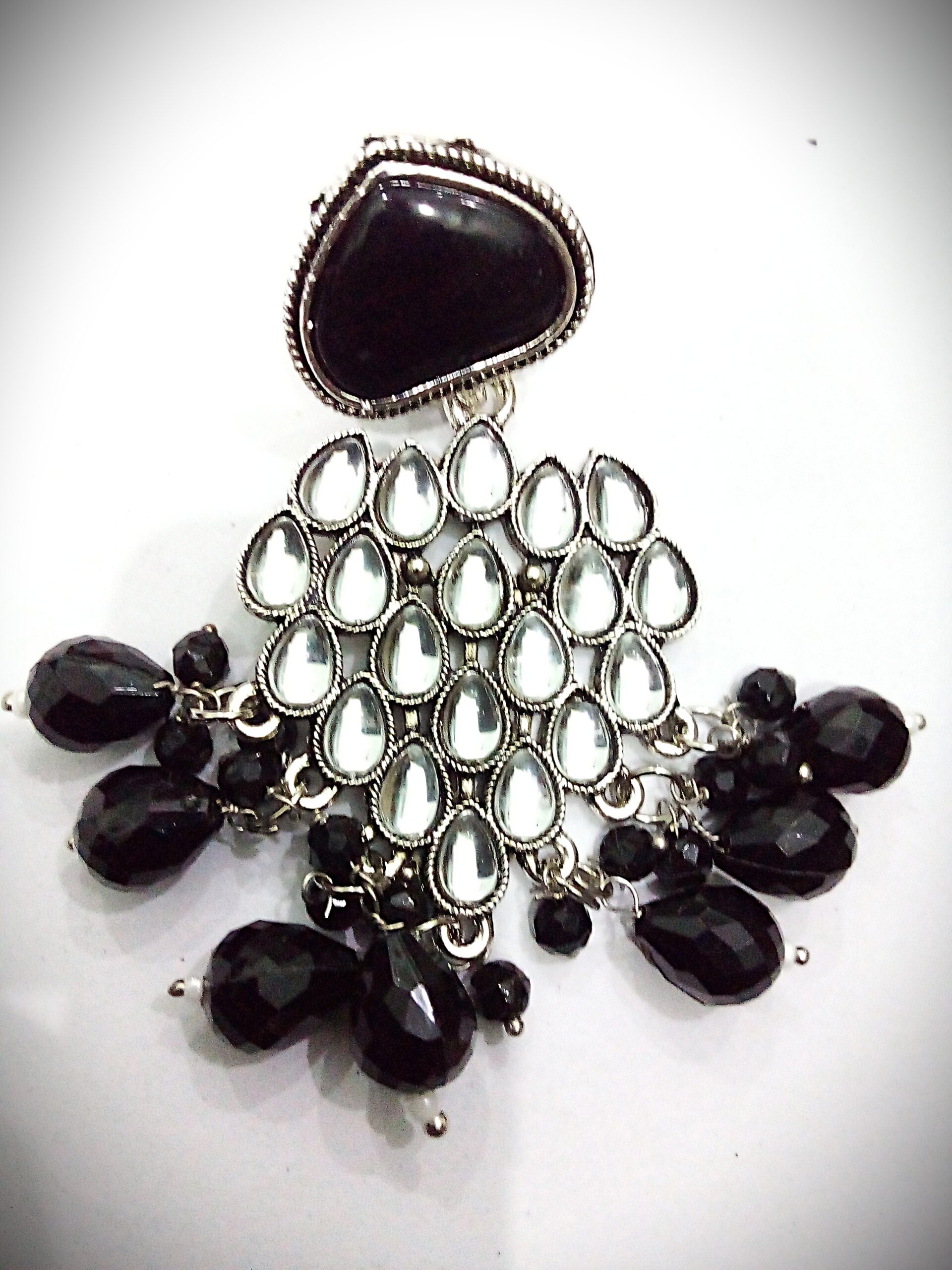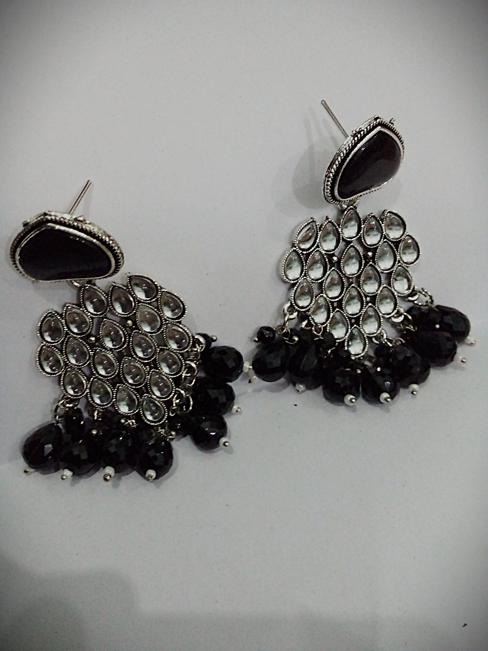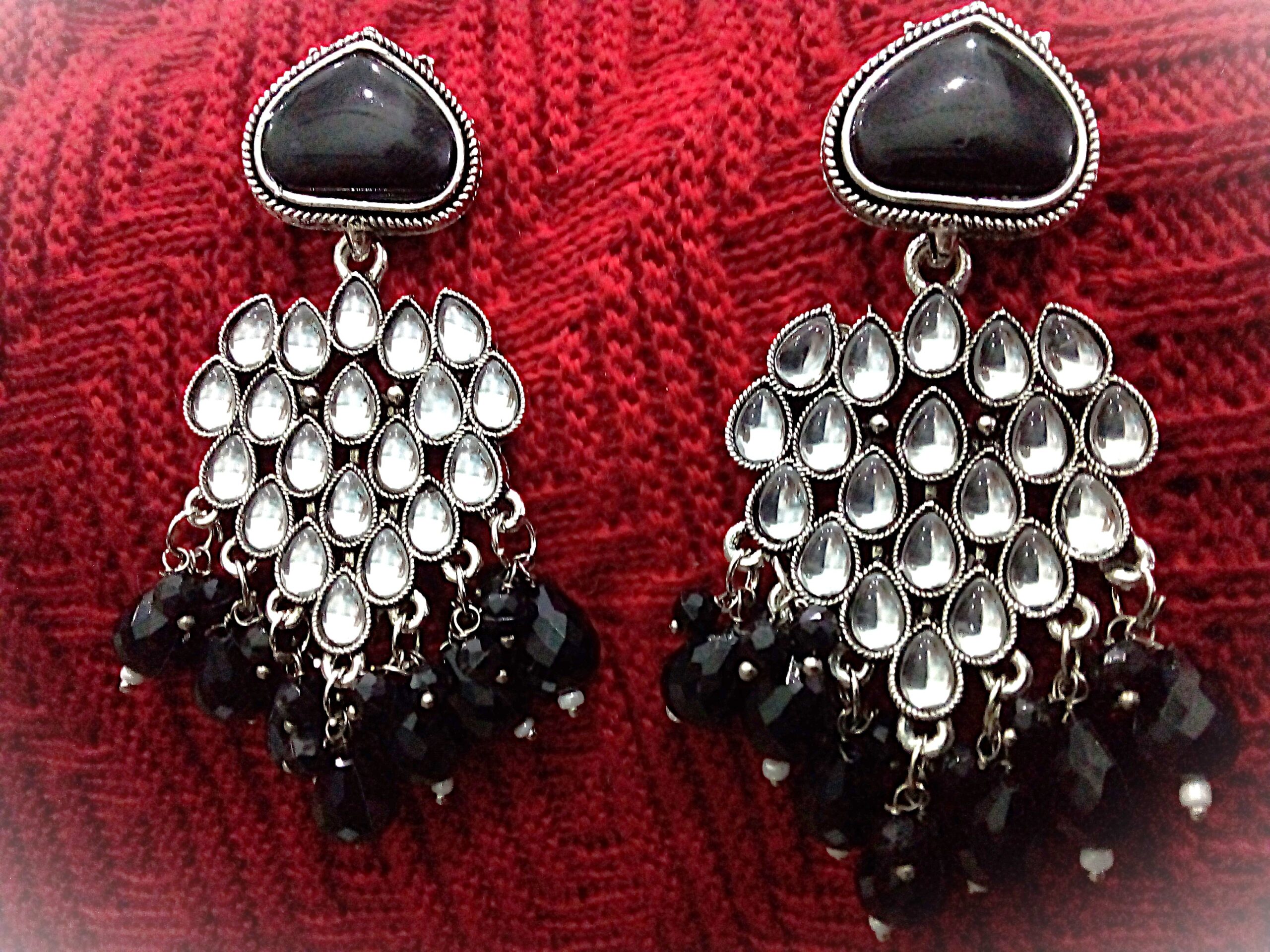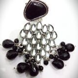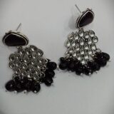 In detail, the image presents two chandelier earrings. Each earring consists of a dark, smooth, cabochon-style stone at the top, set in a silver-toned bezel. Below this, there is a cluster of teardrop-shaped clear crystals, each surrounded by a silver setting. Suspended from the crystal cluster are strands of faceted black beads, giving the earrings a dangling, chandelier-like appearance. The contrast between the clear crystals, black beads, and silver settings provides a visually striking effect. The earrings are positioned on a plain white surface, which highlights their design and allows for a closer examination of their details. The atmosphere is clean and simple, with a focus on showcasing the earrings as the central subject. The mood is elegant and sophisticated, emphasizing the beauty and craftsmanship of the jewelry.