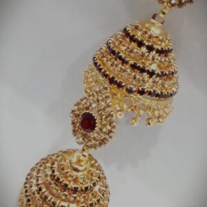 The picture features a pair of elegant chandelier earrings on a white surface, showcasing their intricate design and contrasting colors.