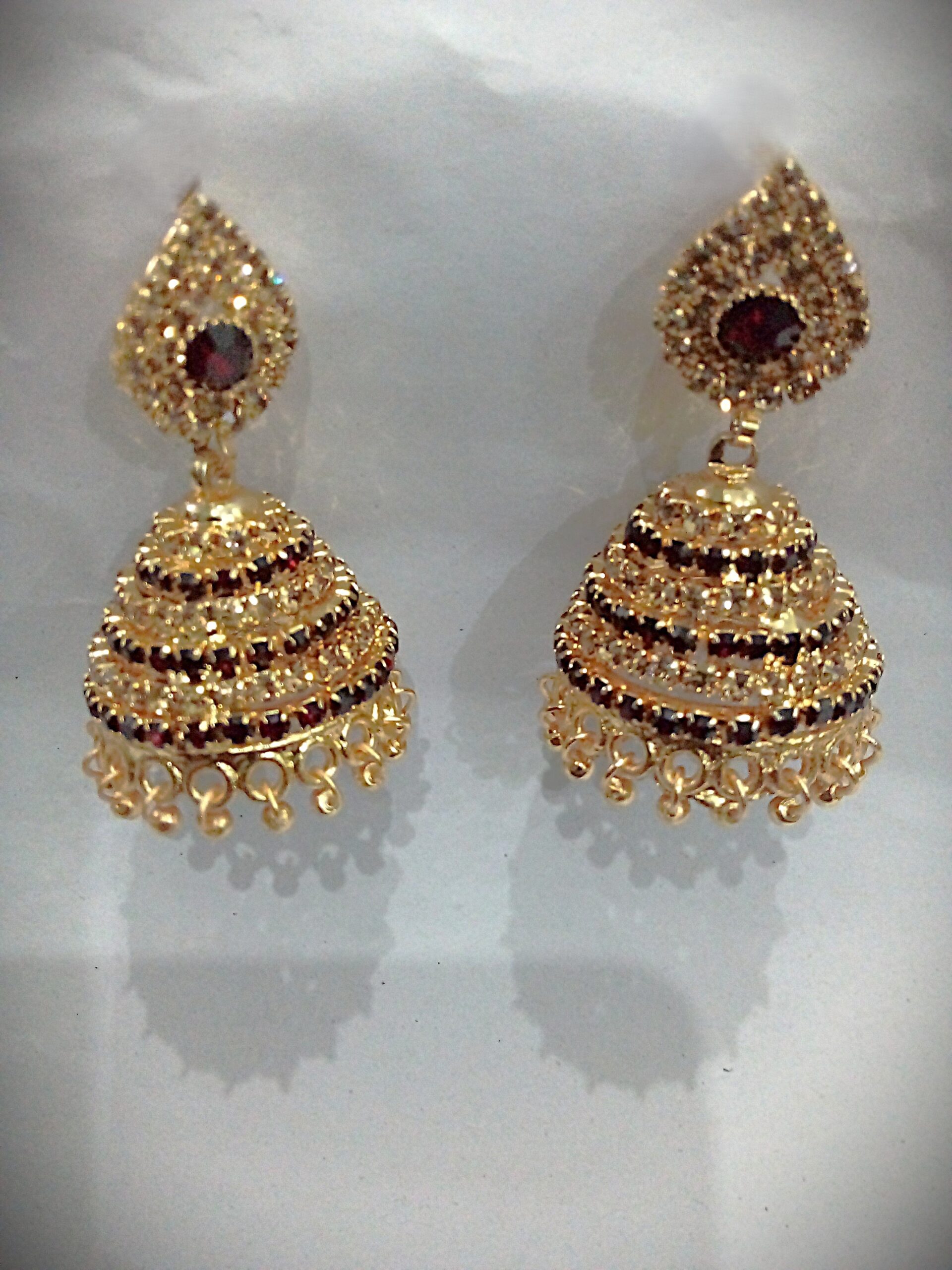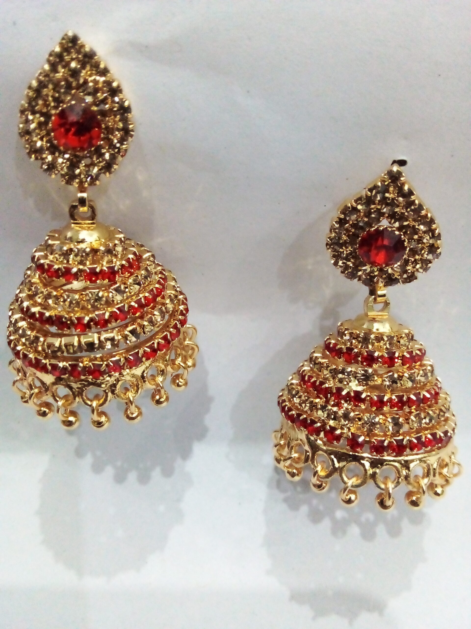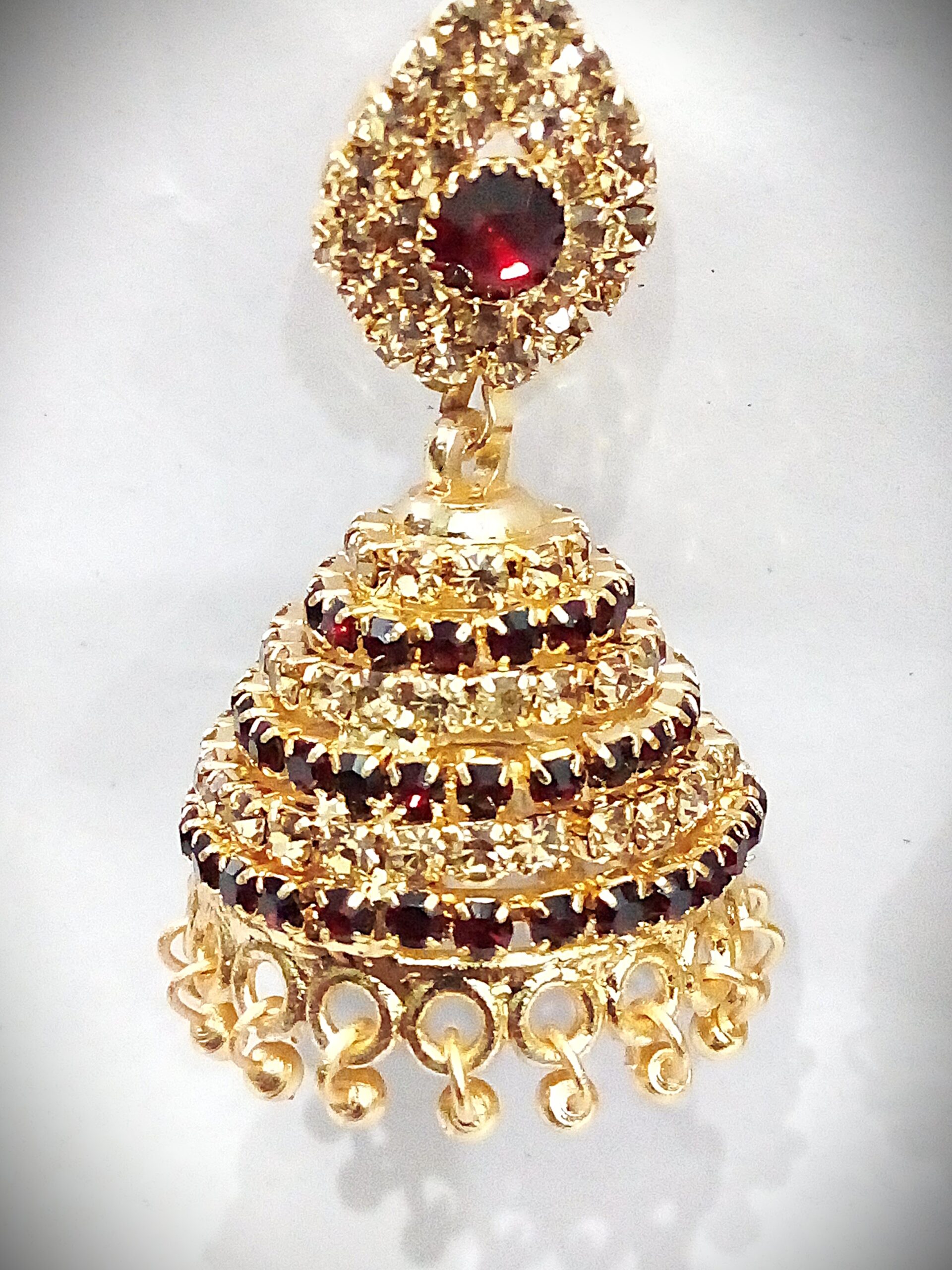 A pair of elegant gold earrings featuring striking red stones, likely rubies. These jewelry pieces serve as fashionable accessories that enhance any outfit with a touch of glamour. Perfect for those who appreciate bling-bling and statement body jewelry.