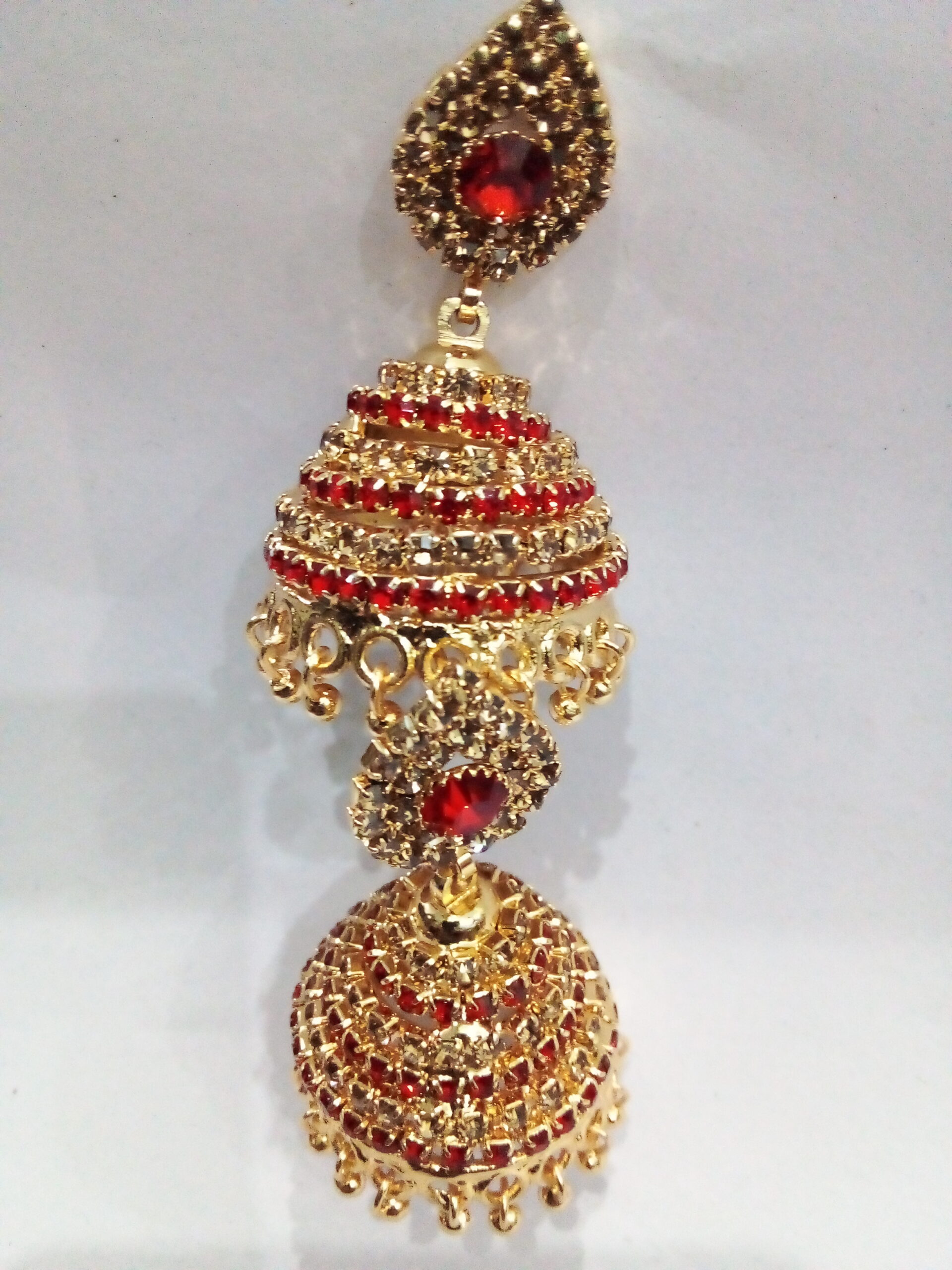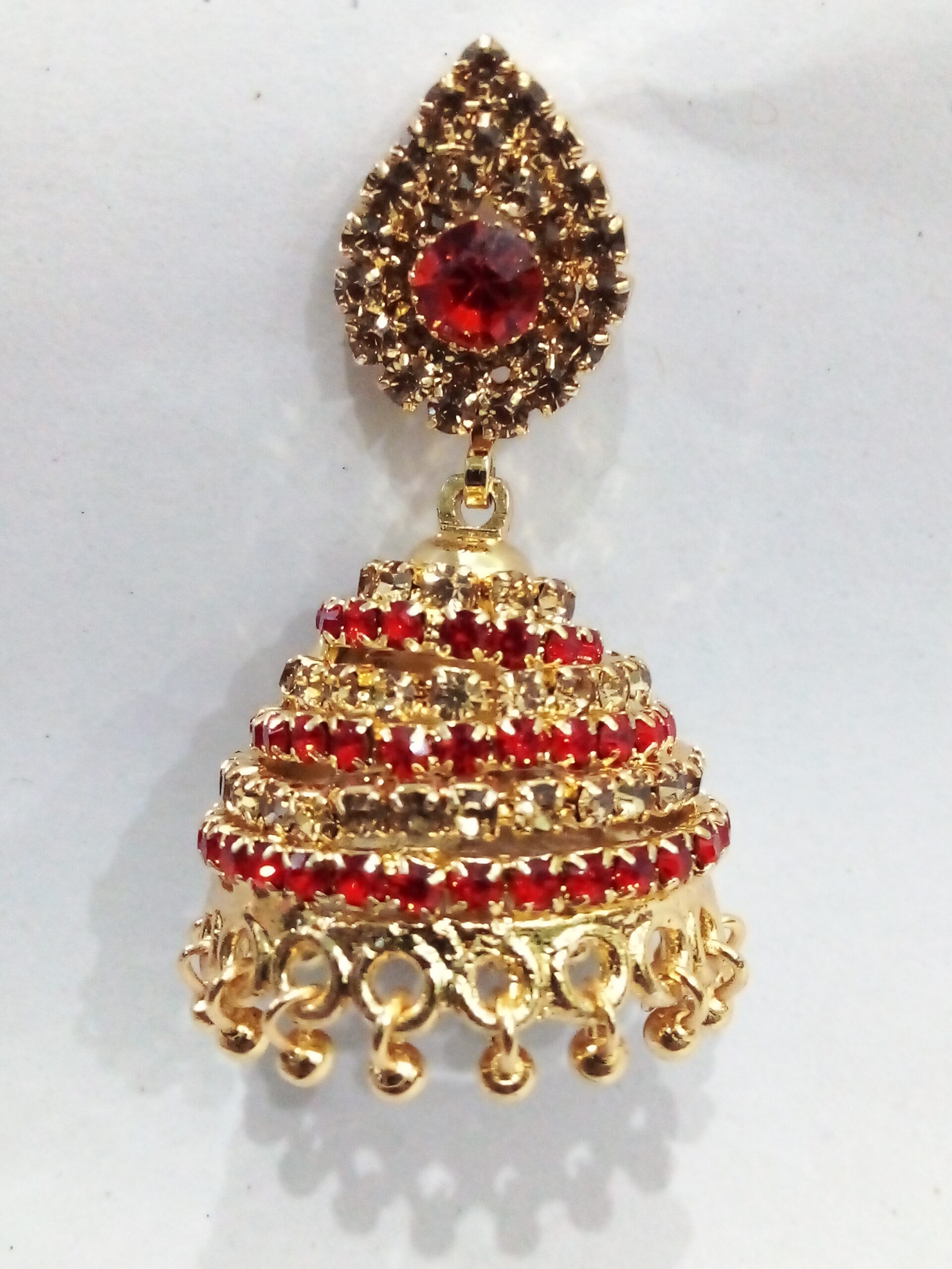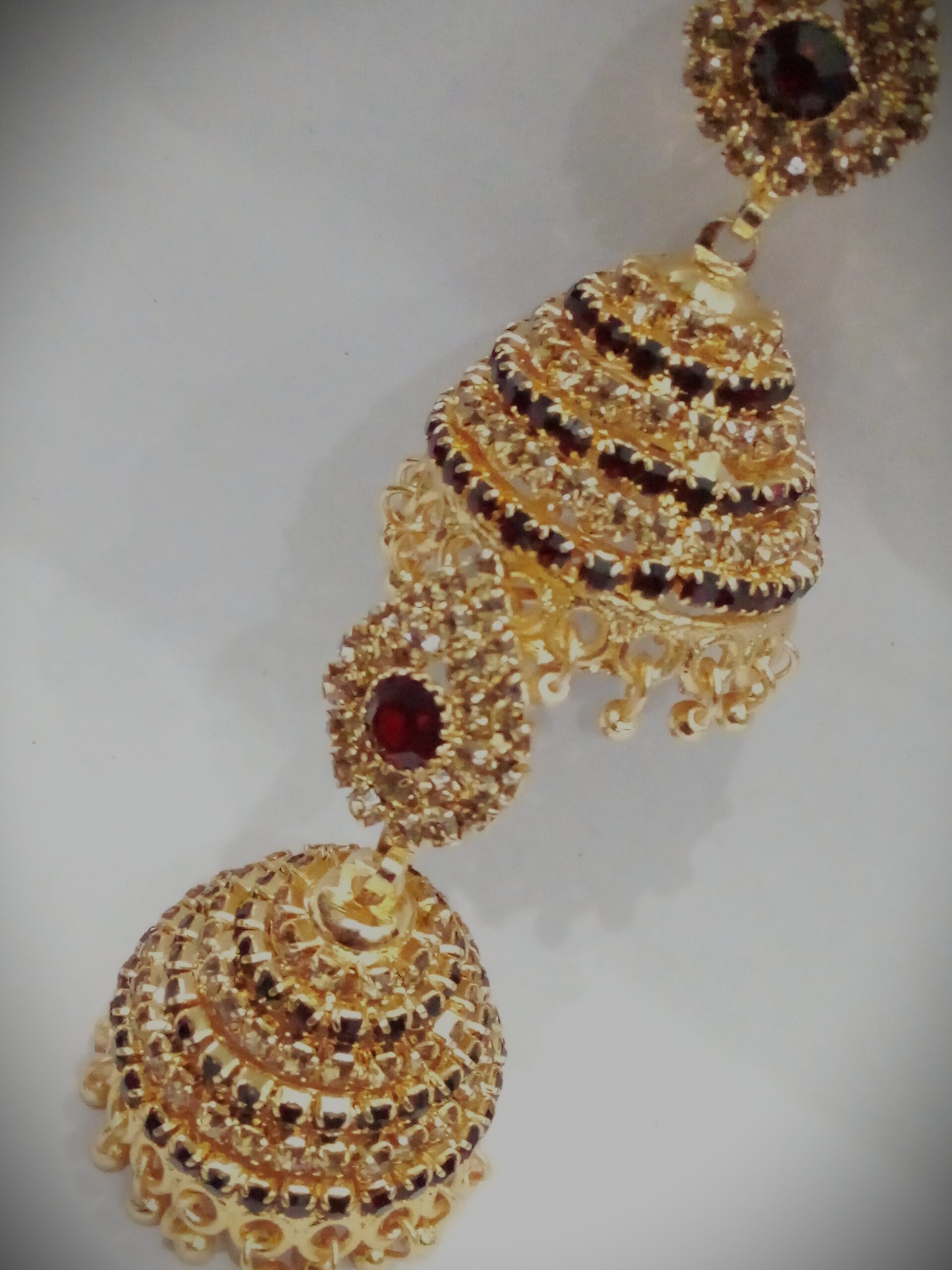 A pair of elegant gold earrings featuring striking red stones, likely rubies. These jewelry pieces serve as fashionable accessories that enhance any outfit with a touch of glamour. Perfect for those who appreciate bling-bling and statement body jewelry.
