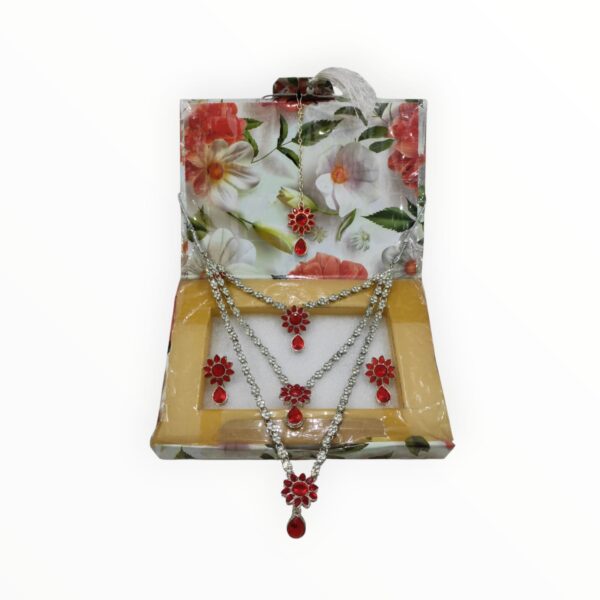 Elevate your bridal look with this stunning stone jewelry set, designed to add a touch of timeless elegance to your special day. This beautifully crafted set features a three-layered necklace adorned with vibrant and teardrop-shaped stones, exuding grace and charm. Accompanied by matching earrings, a maang tikka, and a side jhumar, the intricate silver-toned detailing perfectly complements the bold stones, making it an ideal choice for weddings, festivals, and traditional celebrations. Crafted with care and precision, this set is a perfect blend of tradition and sophistication, sure to make you shine.