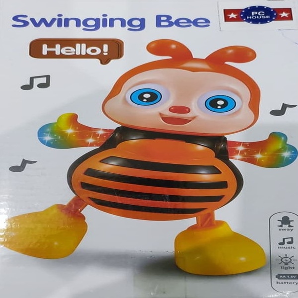 Summary: The image displays the packaging of a “Swinging Bee” toy, featuring a cartoon-like bee character that is designed to sway, play music, and light up.