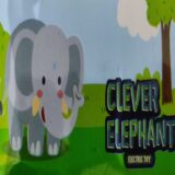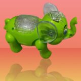 The main subject is a toy elephant made of green plastic, showing off a smooth, glossy finish. It features transparent plastic sections on its back and head, possibly to allow light to shine through. The elephant has cartoonish features, with large, blue eyes and a smiling expression. Its trunk is curved upwards, and its ears are large and transparent, with what looks like a light inside. The toy’s legs are positioned in a walking stance.