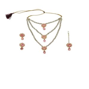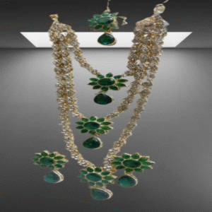 This exquisite Kundan necklace set captures the essence of royal elegance and traditional craftsmanship. Designed with intricate floral motifs and teardrop-shaped stones, it radiates a graceful golden shine that complements any festive or bridal attire. The set includes a beautifully crafted necklace with matching earrings and maang tikka, making it perfect for weddings, cultural events, or grand celebrations. Add this timeless piece to your collection and let every occasion sparkle with sophistication and charm.