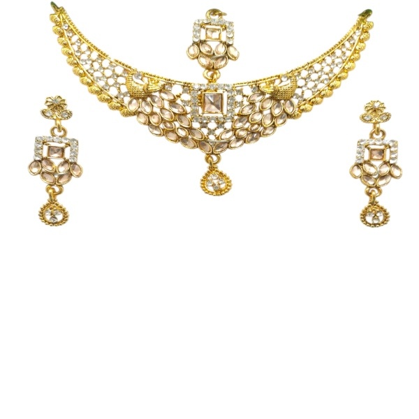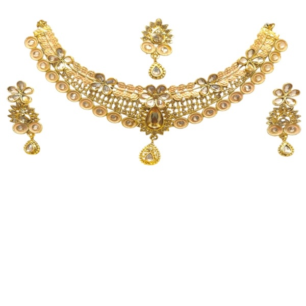 This exquisite Kundan necklace set captures the essence of royal elegance and traditional craftsmanship. Designed with intricate floral motifs and teardrop-shaped stones, it radiates a graceful golden shine that complements any festive or bridal attire. The set includes a beautifully crafted necklace with matching earrings and maang tikka, making it perfect for weddings, cultural events, or grand celebrations. Add this timeless piece to your collection and let every occasion sparkle with sophistication and charm.